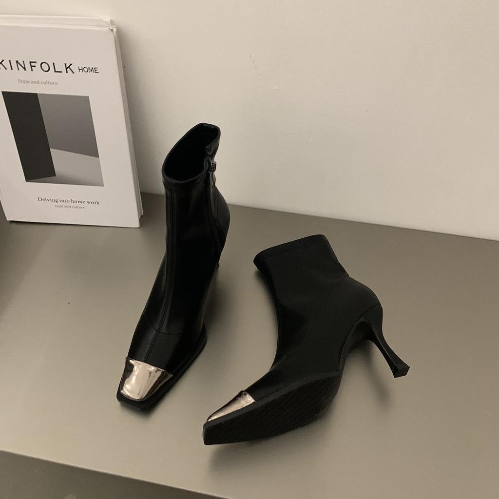 Короткие сапоги с металлическим носком, женские квадратные тонкие каблуки, высокие каблуки, голые сапоги 2024 года, осень и зима, новые эластичные сапоги, мягкие кожаные тонкие сапоги