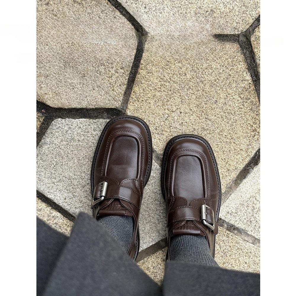 Маленькие кожаные туфли с квадратной пряжкой на ремне, женские туфли 2025 года на толстом каблуке в студенческом стиле, ленивые универсальные туфли-лодочки