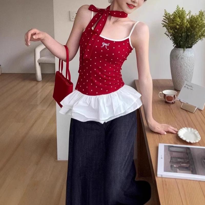 Женская красная балетная майка в горошек с бантом и отделкой из гофрированной ленты