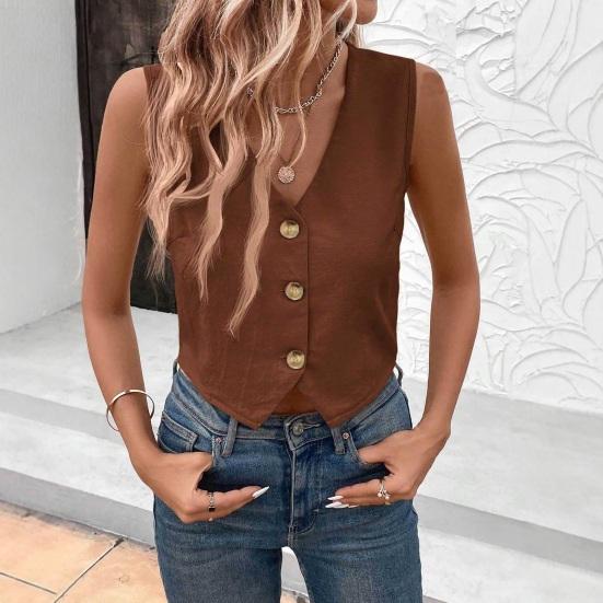 Дополните свой гардероб этим универсальным женским жилетом в стиле ретро.. Этот жилет без рукавов с застежкой на пуговицу спереди, V-образным вырезом и талией, подчеркивающей изгибы фигуры, можно легко сочетать с рубашкой или юбкой, создавая шикарный образ..