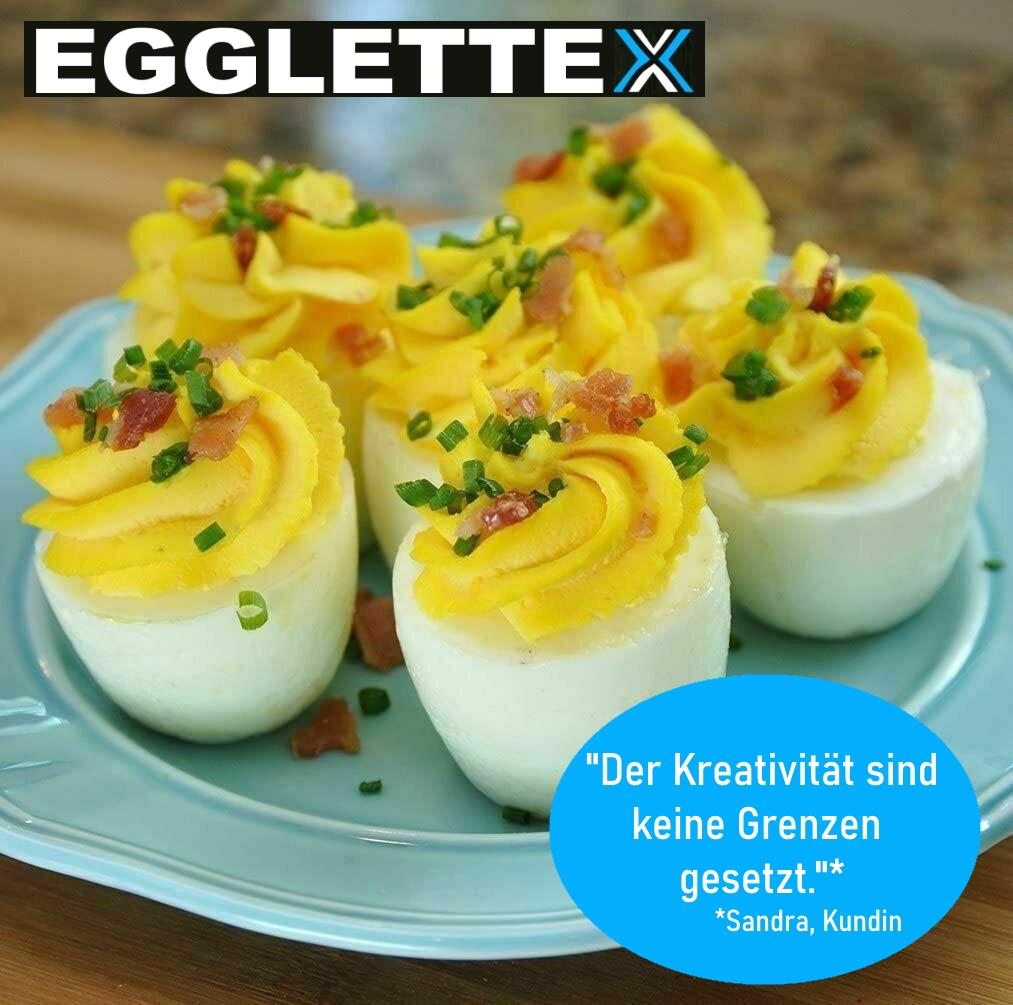 Конечно, в EGLETTEX можно добавить любые другие ингредиенты. (если они узкие), например, овощи или специи. Так получаются крутые яйца с разными вкусами. Форма яйца позволяет придумывать и воплощать в жизнь креативные блюда.