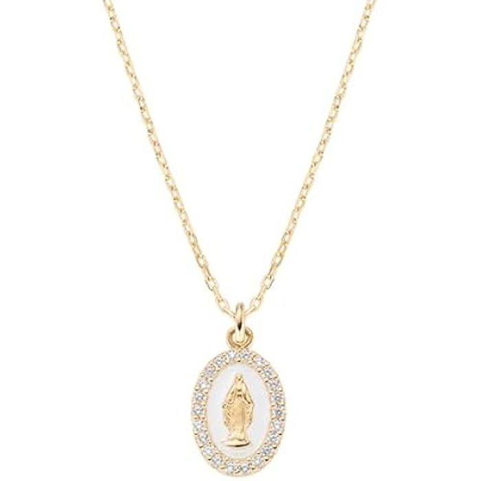 AMEN Bijoux, collier médaille miracoculeuse émaillée blanc perle, collier femme argent 925 doré, zircons blancs, cadeau femme