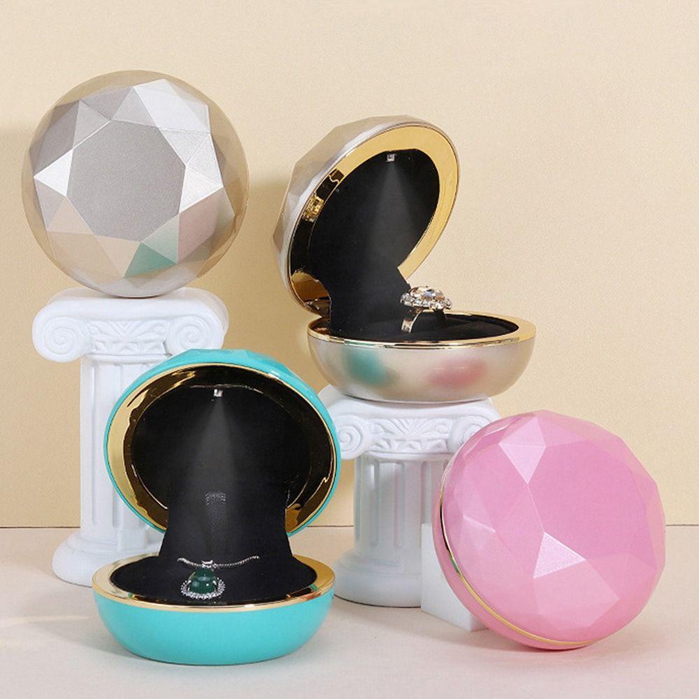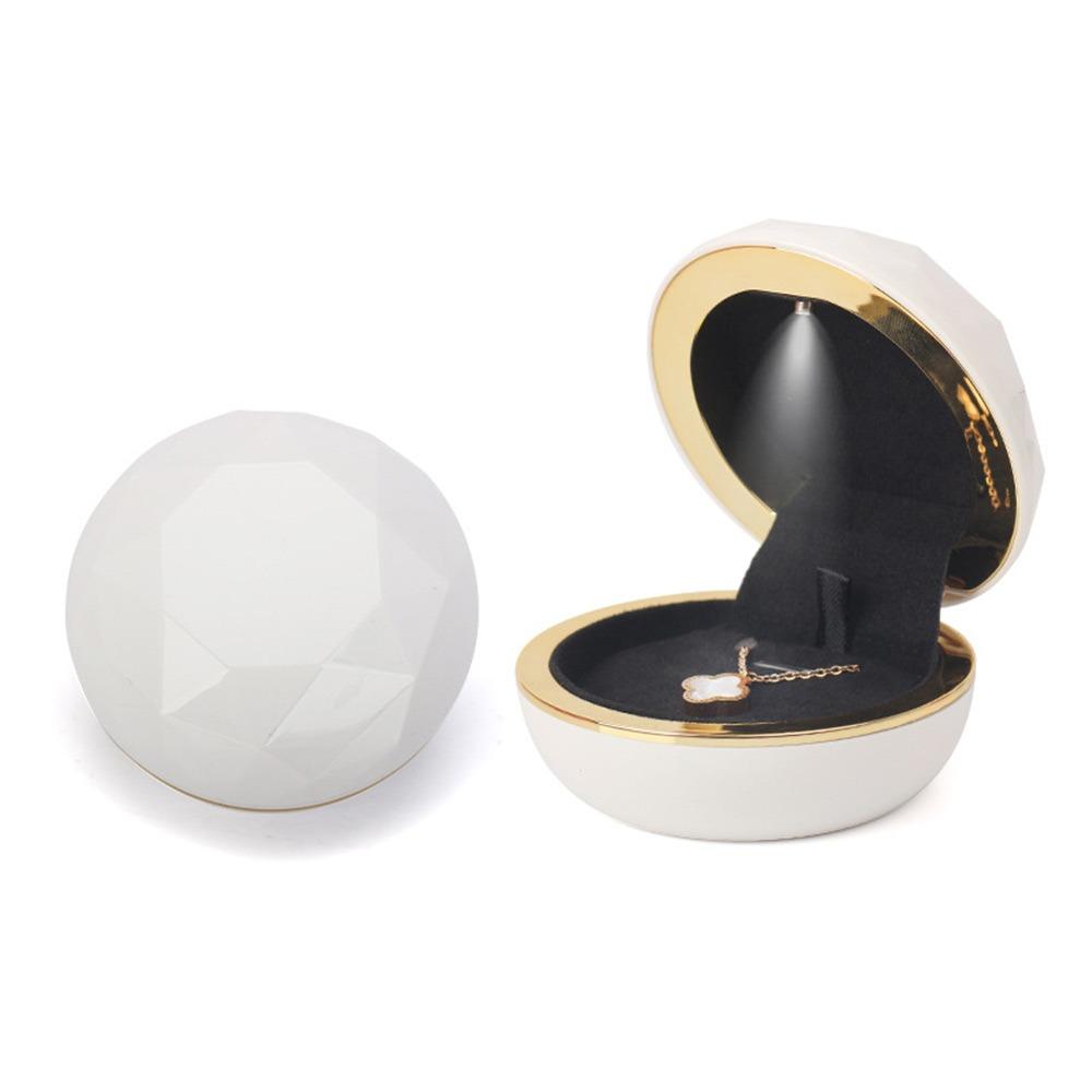 Make your special moments unforgettable with this luxurious round LED illuminated jewellery ring box. Designed with sophistication in mind, this ring box combines a rounded shape with elegant gold trim to create the perfect backdrop for your precious ring. The push-button operation reveals a delicate velvet lining, and the built-in LEDs emit a soft ambient light to make your ring sparkle. Whether it's for a proposal, anniversary or simply to display your jewellery, the attention to detail and quality of this ring box is unparalleled. The LED light is carefully positioned to showcase the sparkle of your ring, allowing the diamond to dance in the light and capture the sheer joy of the moment.