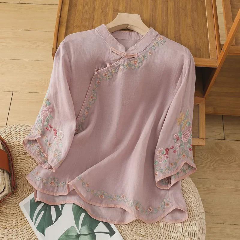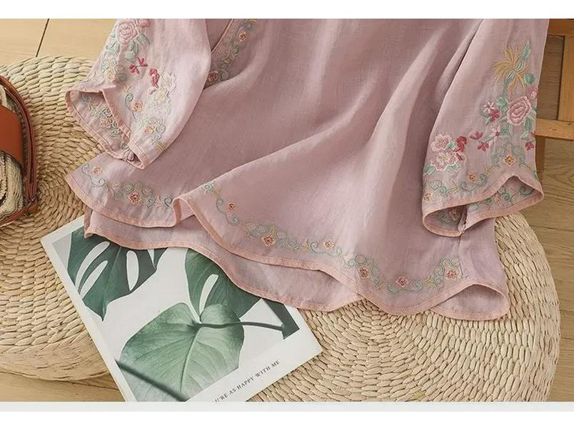 Ощутите непреходящую элегантность с женской вышитой рубашкой из хлопка и льна в стиле ретро.. Эта рубашка изготовлена из уникального сочетания хлопка и льна, что обеспечивает комфорт и воздухопроницаемость.. Дизайн подчеркивается застегивающимся на пуговицы лацканом и характерным вырезом-стойкой, что придает изысканность любому наряду.. Рукава три четверти обеспечивают универсальный вид, идеально подходящий для разных случаев.. Свободный крой обеспечивает легкость и свободу движений, что делает его идеальным выбором как для повседневной, так и для полуофициальной обстановки.. Эта рубашка, украшенная изысканной вышивкой, гармонично сочетает в себе классический стиль и современный стиль.