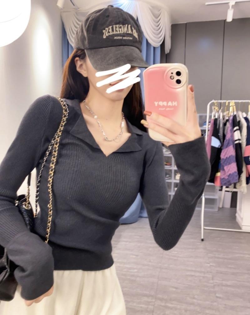 Вязаный свитер молочно-абрикосового цвета с V-образным вырезом для женщин - весна-лето 2025, сладкий и пряный воротник-поло, топ с длинными рукавами, нижняя рубашка