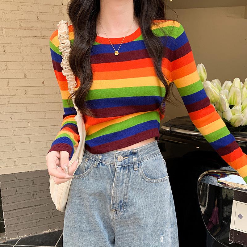2025 Приталенный корейский свитер с радужными полосками, открывающий пупок — купить товар онлайн с бесплатной доставкой по всему миру!