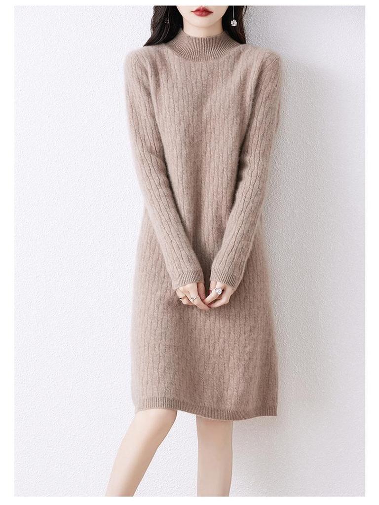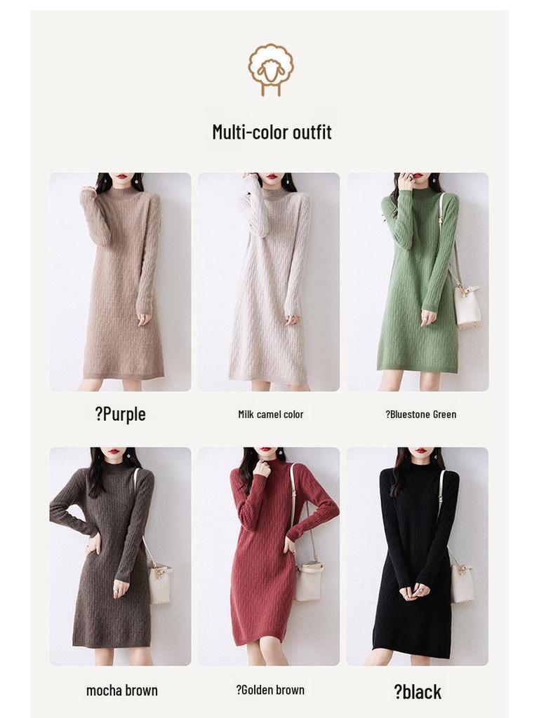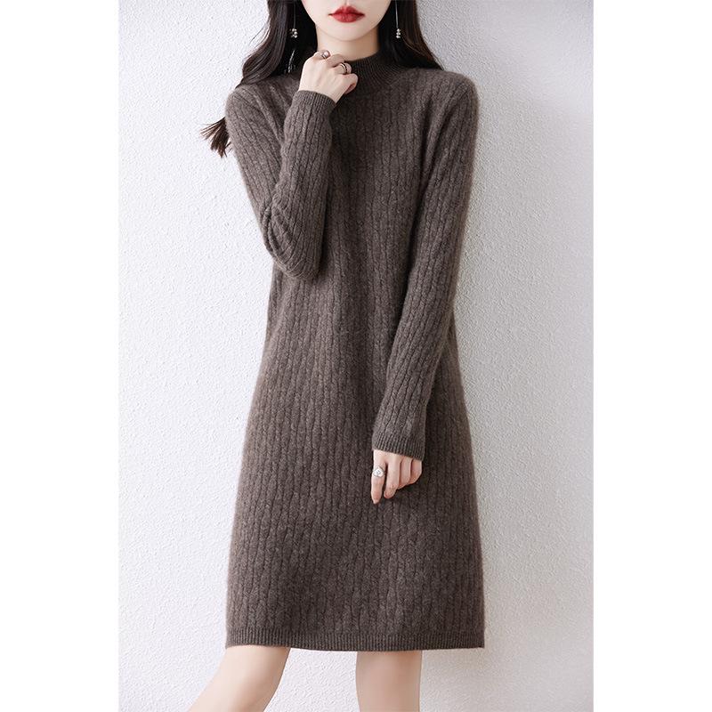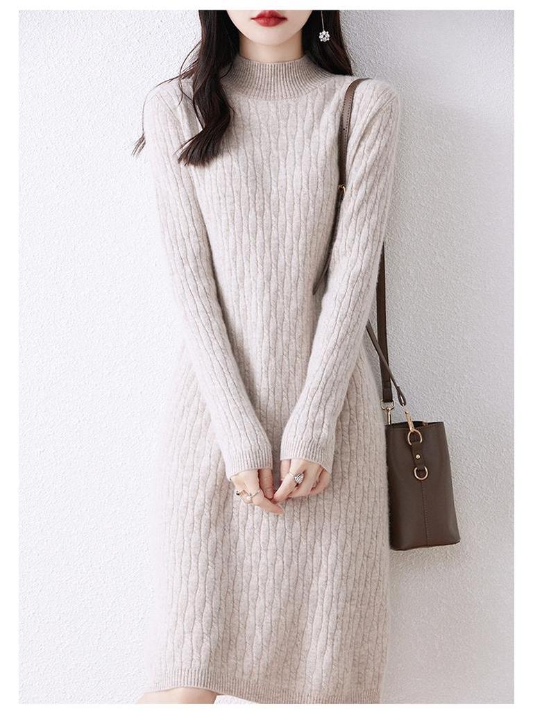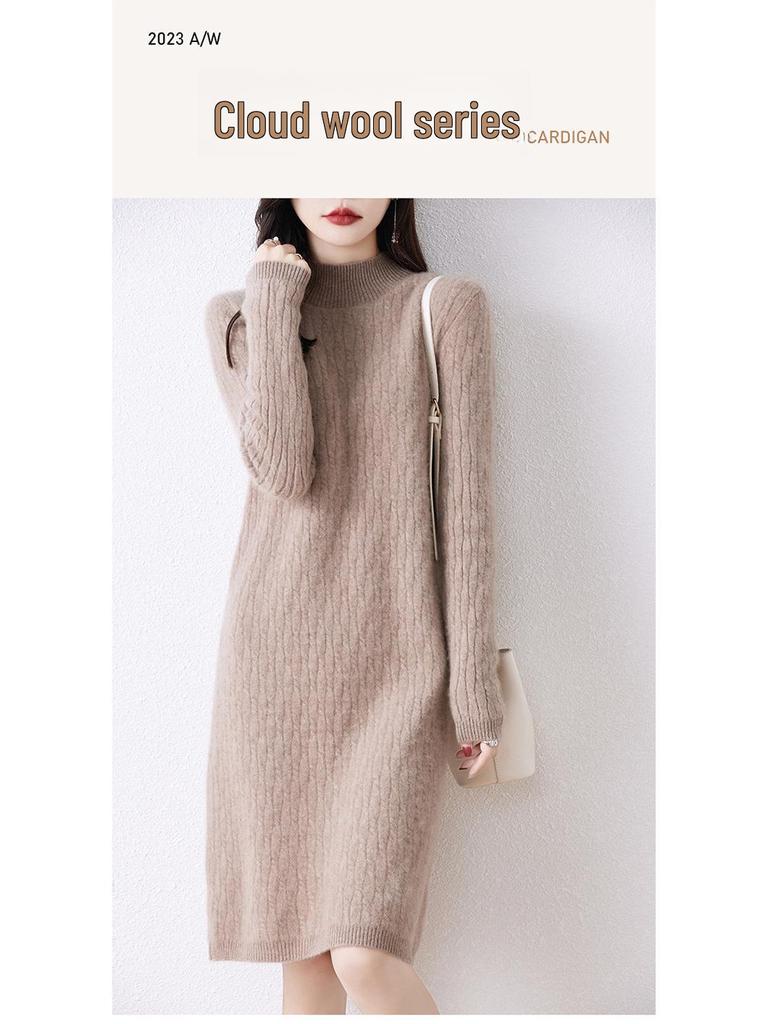2023 Осень/Зима Женское Свободное Платье-Свитер С Полувысоким Воротником Из Чистой Шерсти Вязание Косами
