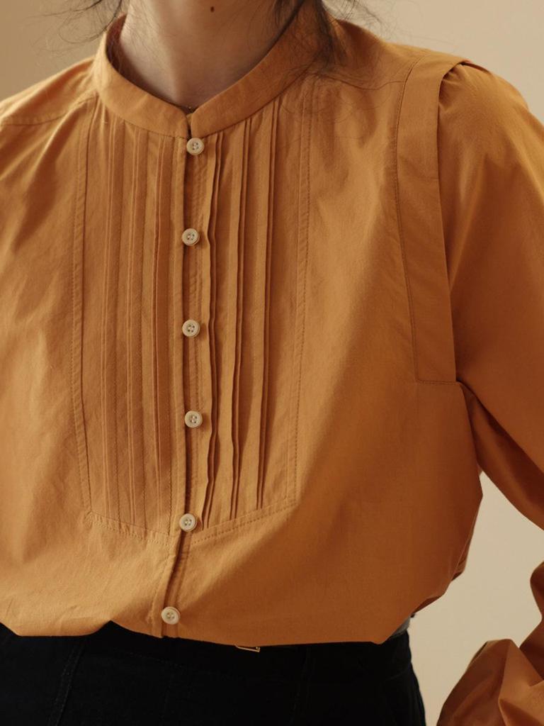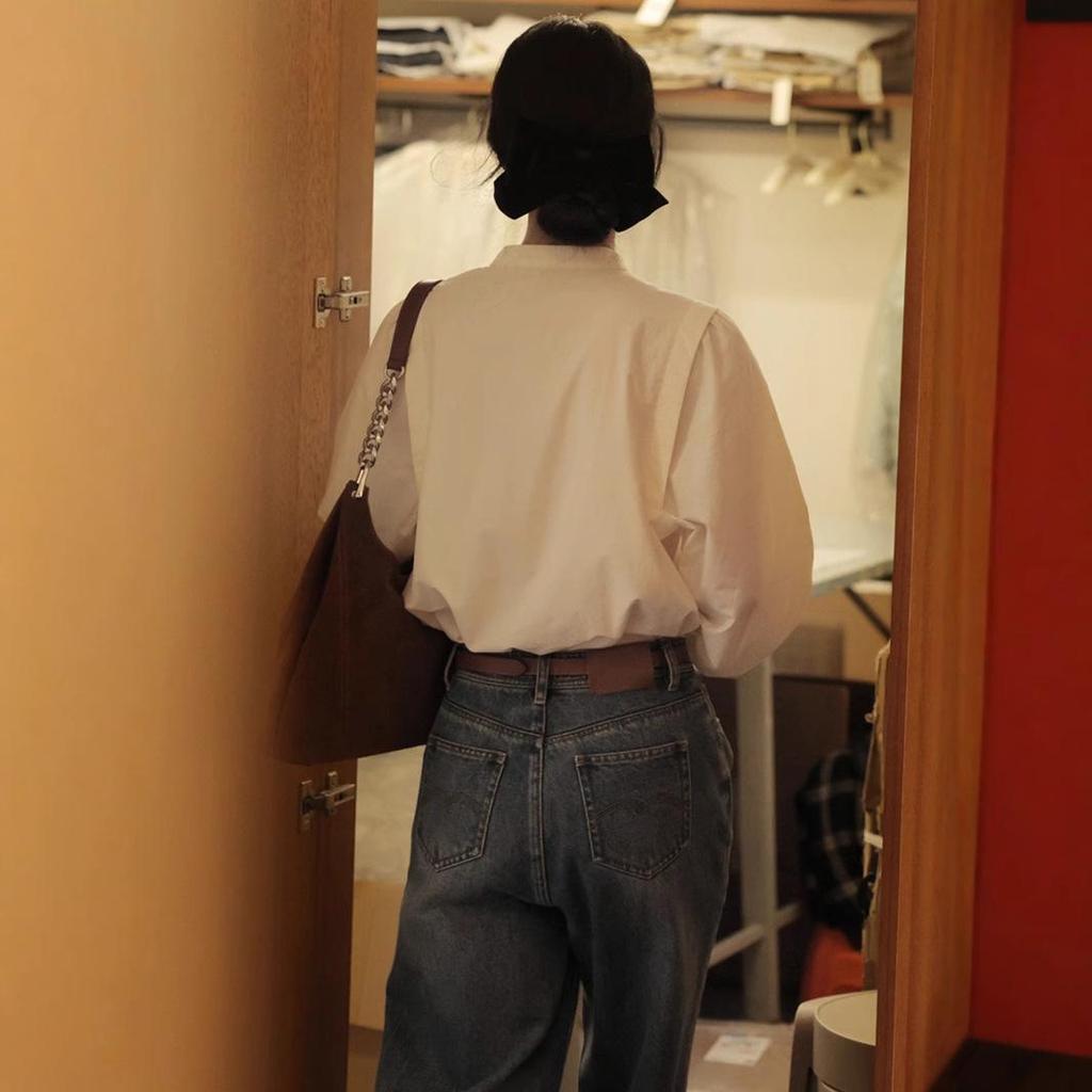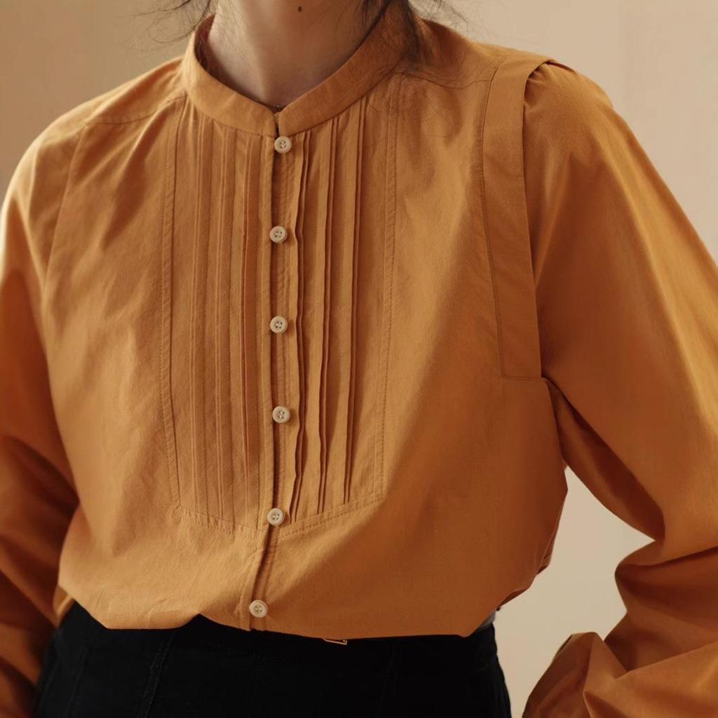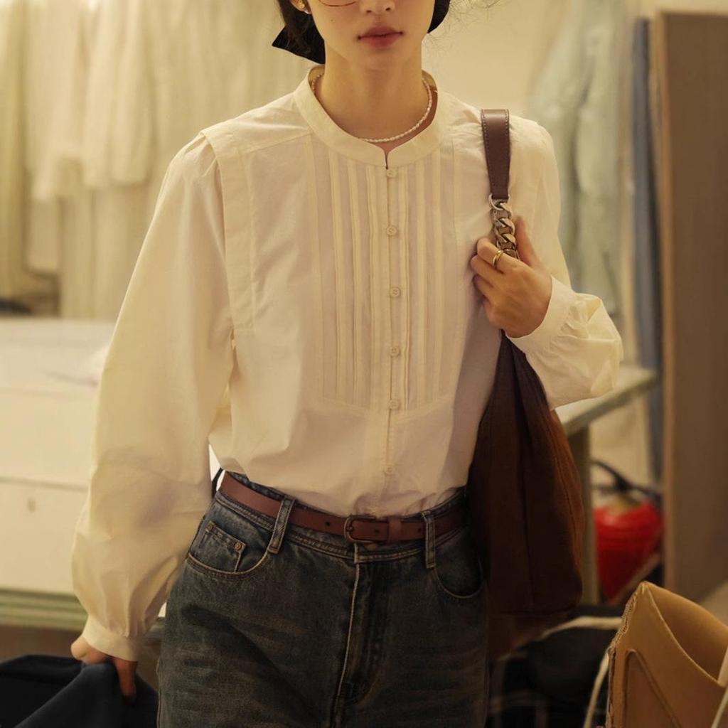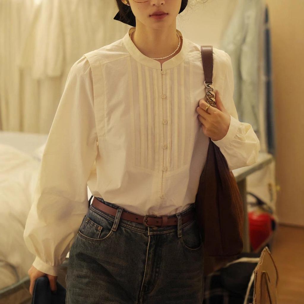 Женская рубашка осень 2025 года с рукавами-фонариками и воротником-стойкой во французском стиле в стиле ретро – свободная, с длинным рукавом, элегантный дизайн