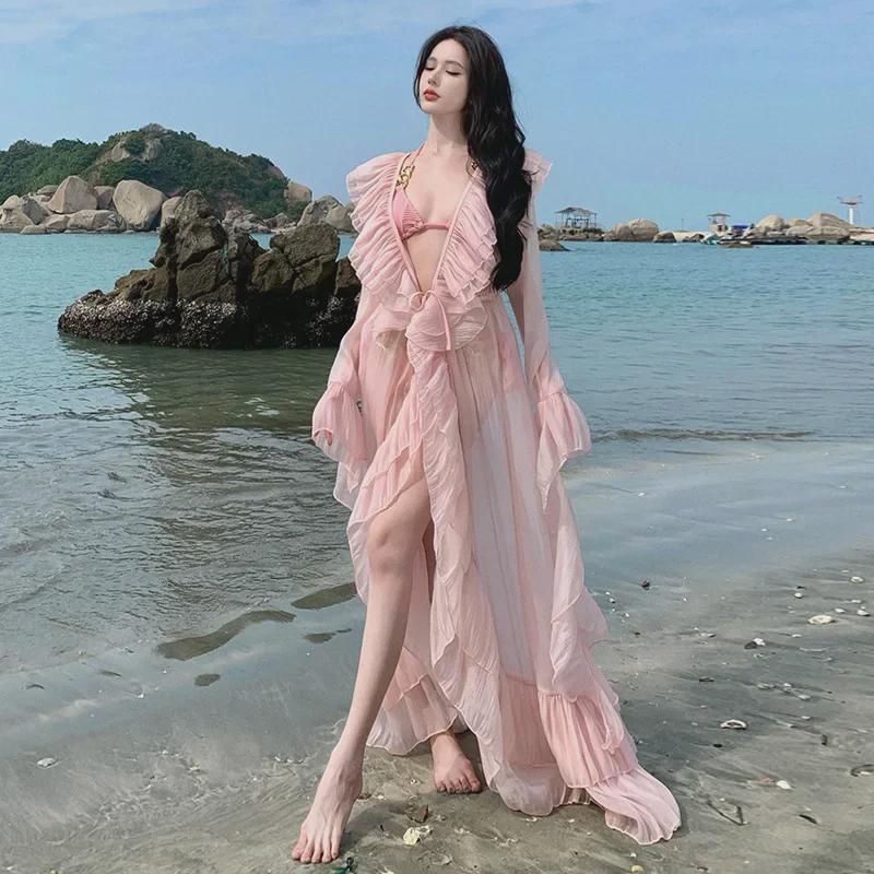 Элегантное французское романтическое солнцезащитное платье-кардиган для отдыха на море