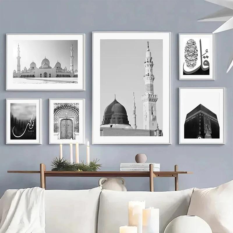 Черно-белая исламская мечеть дверь холст картина мусульманская цитата настенное искусство плакат печать для домашнего декора