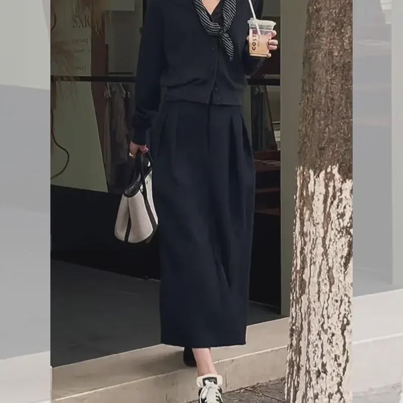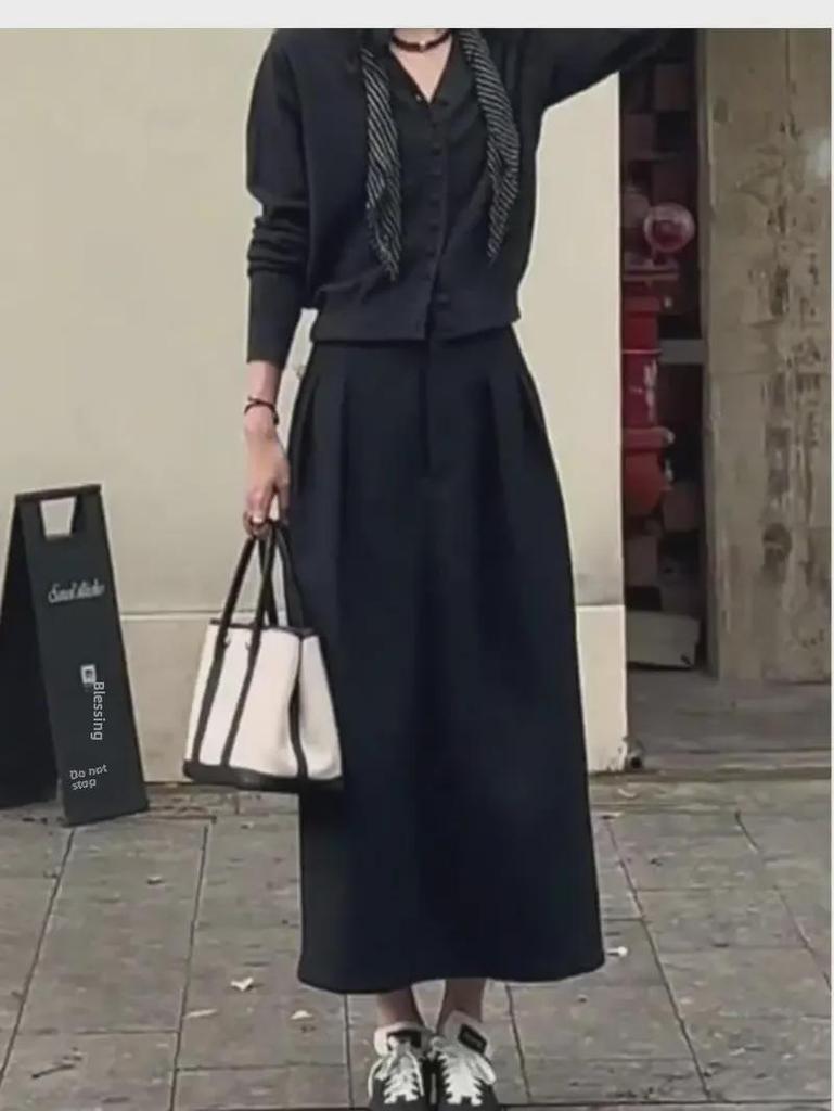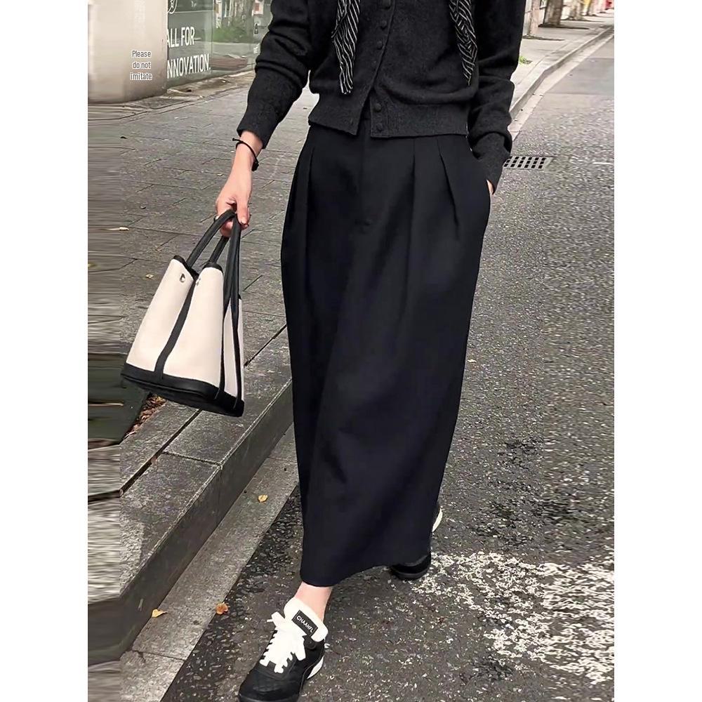 2025 Черная плиссированная женская юбка с разрезом: Большой размер, утягивающий, повседневный цветочный дизайн на осень/зиму.