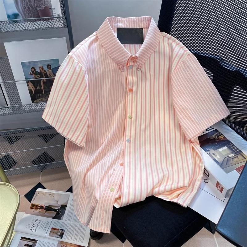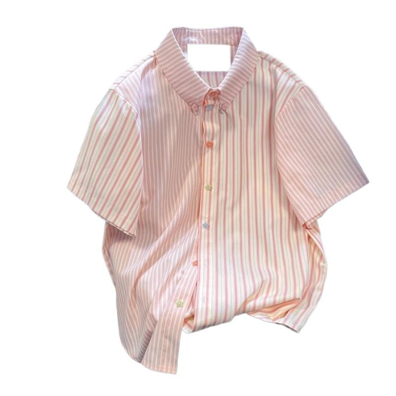 Рубашка женская в полоску розового цвета с цветными пуговицами, летняя, с короткими рукавами, в студенческом стиле, свободная, с отложным воротником, женская рубашка