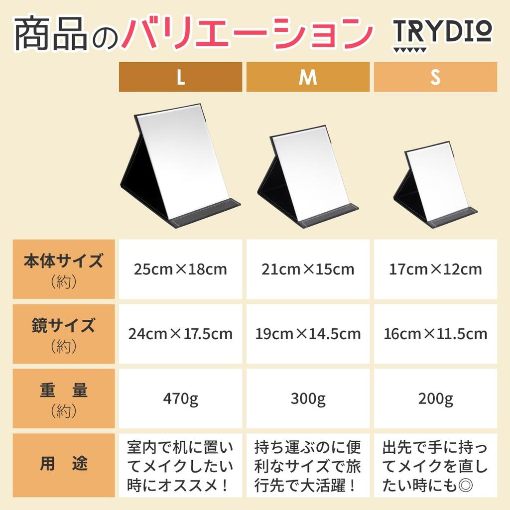 [Содержимое набора] Зеркало на подставке x 1 шт. [Цвет] Черный [Размер (ок.)] Л: 25 см в длину x 18 см в ширину x 1 см в толщину, M: 21 см в высоту x 15 см в ширину x 1 см в толщину, S: Высота 17см x Ширина 12см x Толщина 1см [Вес (ок.)] Л: 470г, М: 300г, С: 200г [Материал] Корпус: Зеркальная крышка: Кожа PU