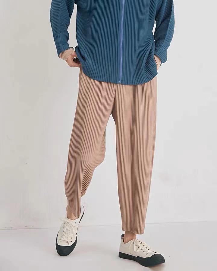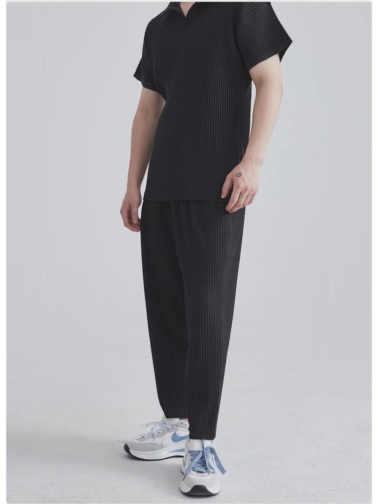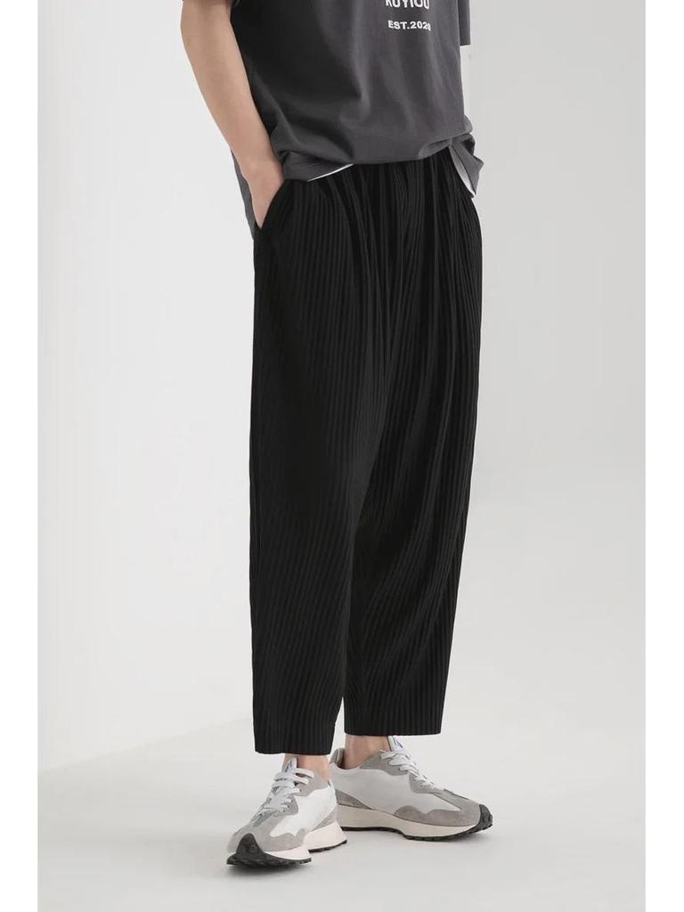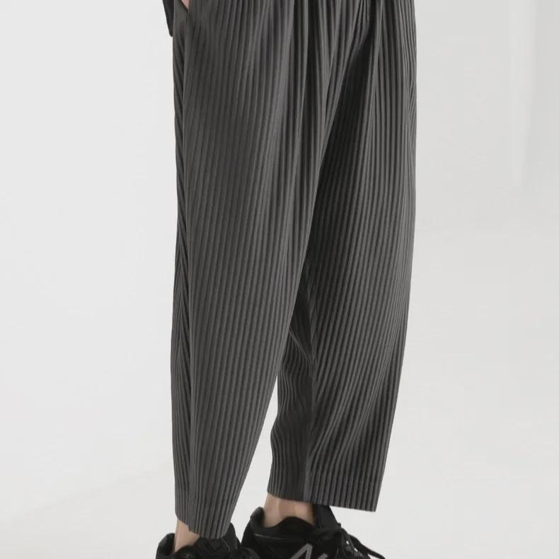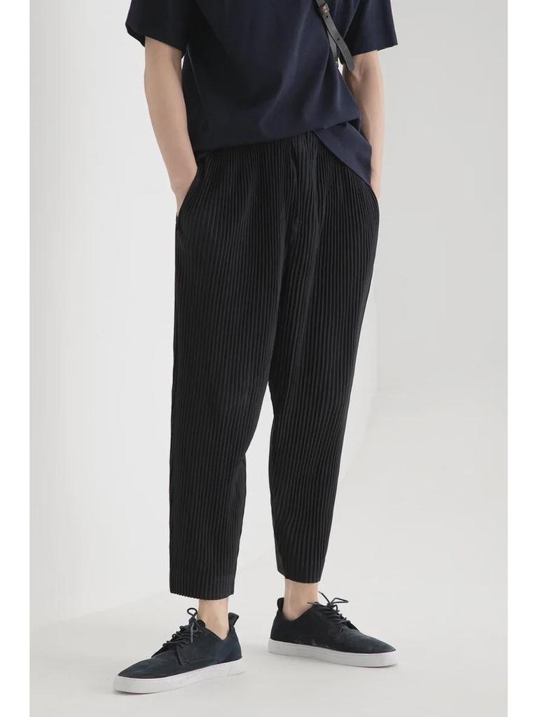 Откройте для себя комфорт и стиль этих мужских летних свободных брюк-каррот со складками Nine-Point, выполненных в характерном японском стиле.. Эти брюки имеют гибкий эластичный пояс для удобства ношения и полностью изготовлены из высококачественного полиэстера, что обеспечивает как прочность, так и легкость.. Идеально подходящие для теплой погоды, их уникальный плиссированный дизайн и длина в девять точек создают современный, непринужденный образ, подходящий для различных повседневных случаев.