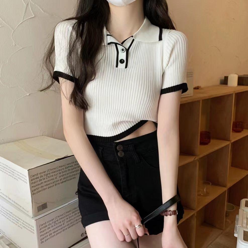 Футболка-поло с цветным воротом, стандартными плечами, трикотажная, с короткими рукавами для женщин, облегающая, летняя, с дизайнерским смыслом, короткая футболка