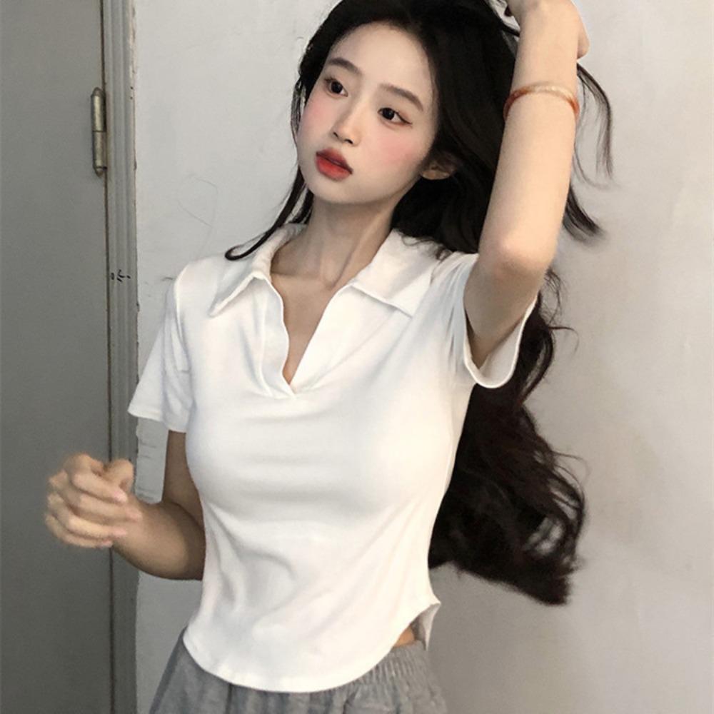 Футболка с короткими рукавами, женская короткая узкая футболка, летний дизайн, популярная верхняя одежда для девочек в стиле ретро, поло
