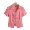 Lapel Button Pleated Cardigan Sweet Casual High-end Short-sleeved Women's T-shirt Korean Style Slim Stretch Cotton Top