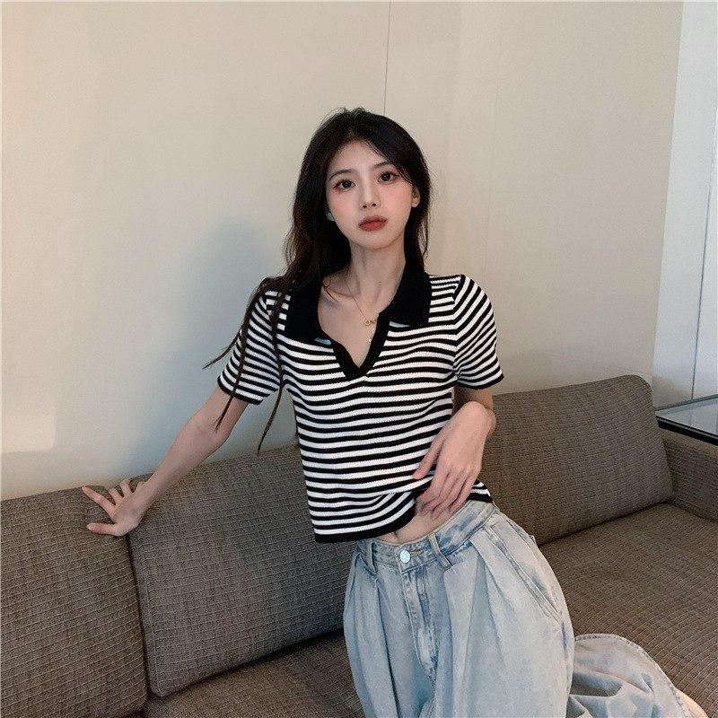 Летние женские трикотажные поло с короткими рукавами и высокой талией, тонкая футболка из ледяного шелка с воротником-поло, полосатые футболки черного, синего цвета