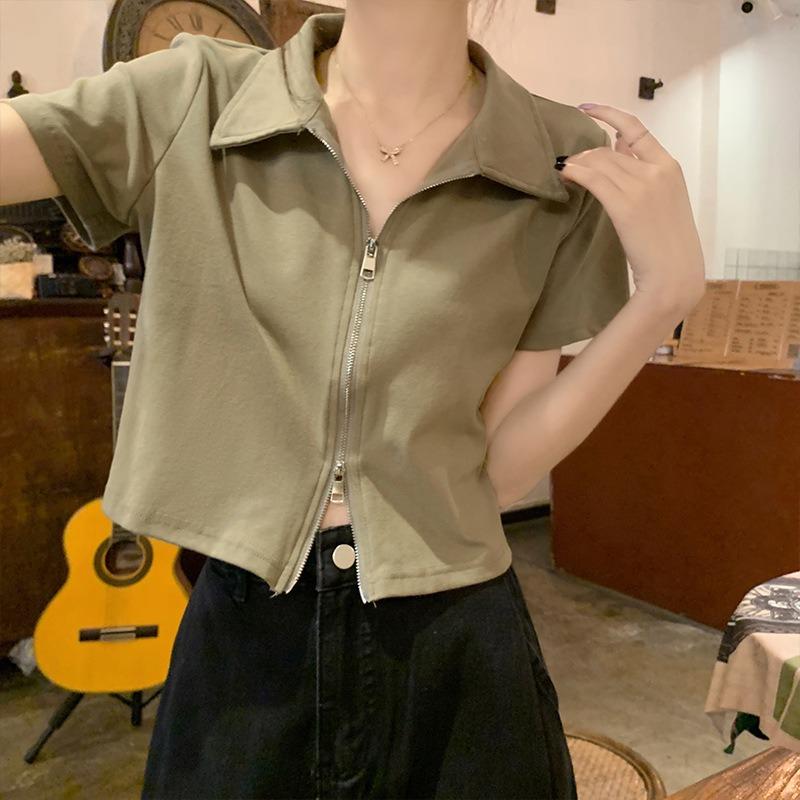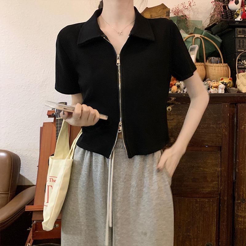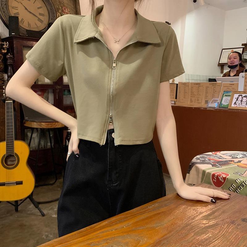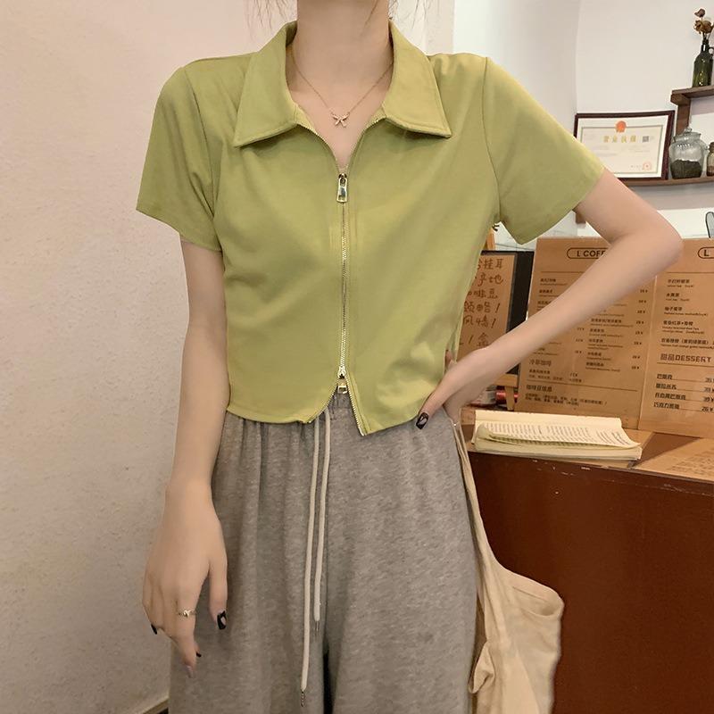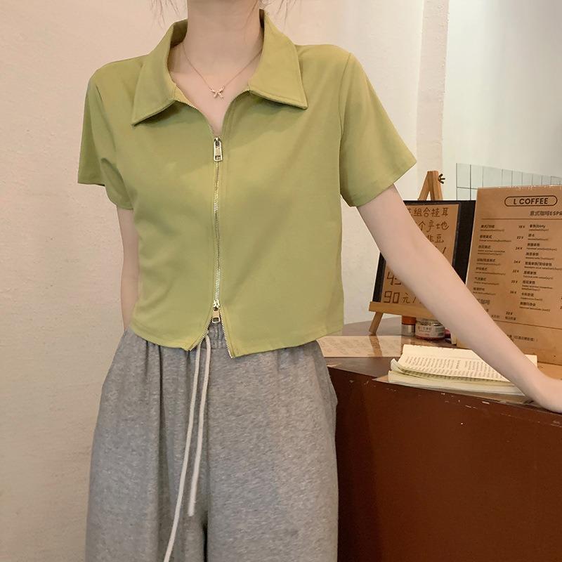 Хлопковая рубашка поло с короткими рукавами и лацканами, женская летняя тонкая короткая футболка с короткими плечами и топами на молнии