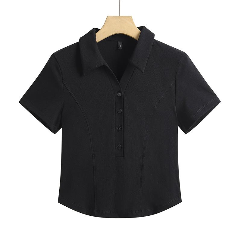 Женская футболка весна-лето с отворотом на пуговицах, короткая, с высокой талией, облегающая, с коротким рукавом, женская футболка-стрейч
