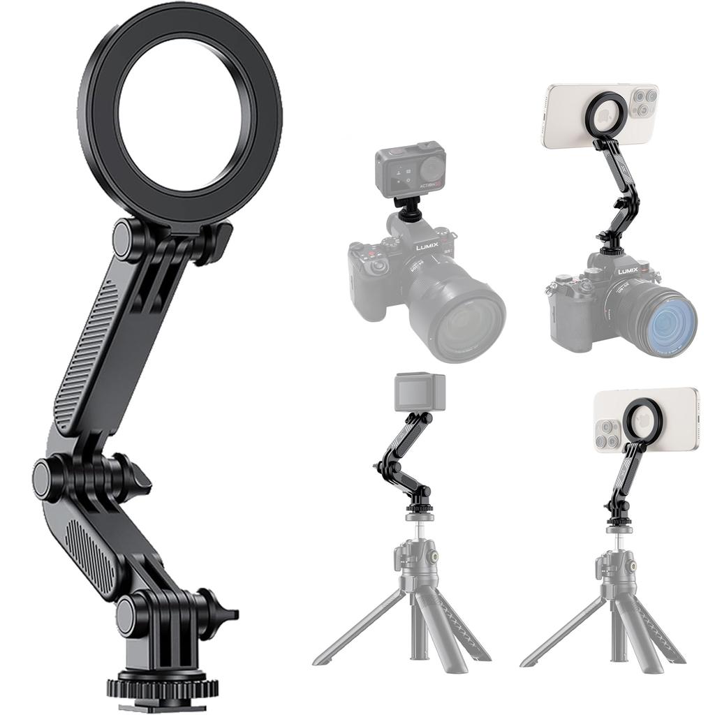 [С креплением «холодный башмак», отверстием с резьбой 1/4 дюйма, магнитного типа] Держатель для смартфона оснащен отверстием с резьбой 1/4 дюйма и креплением «холодный башмак». Вы можете делать снимки на штативе, головке камеры, палке для селфи и т. д.. Имеет холодный башмак, поэтому его можно прикрепить непосредственно к горячему башмаку камеры.. Удобно для крепления вашего смартфона к магниту и использования его в качестве дисплея камеры.