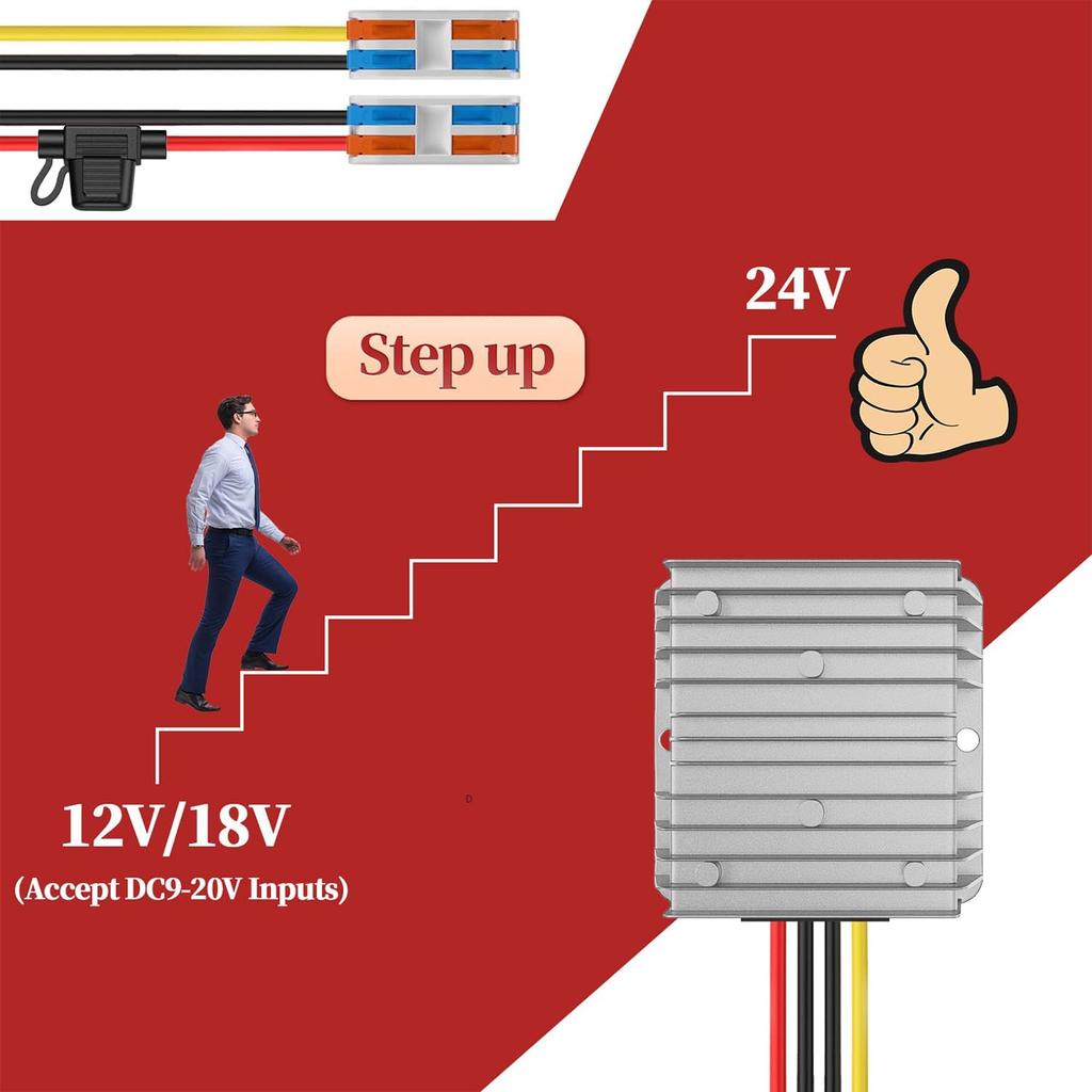 Этот высокопроизводительный повышающий DC-DC-преобразователь способен эффективно преобразовывать 12 В в 24 В.. Поддерживает широкий диапазон входного напряжения постоянного тока 9-20 В.. Благодаря высоконадежной конструкции со встроенными предохранителями и удобными быстроразъемными соединениями он быстро реагирует на перенапряжение или неисправности в цепи и отключает питание для защиты вашего оборудования.. Он также имеет степень водонепроницаемости IP67, что делает его достаточно прочным, чтобы выдерживать использование в различных условиях.. Подробные характеристики и преимущества продукта Высокоэффективная технология повышающего преобразования: Эффективно преобразует 12 В в 24 В, обеспечивая высокую энергоэффективность. Высокая скорость преобразования минимизирует потери мощности и обеспечивает стабильное питание 24 В.. Расширенные функции безопасности: Оснащен предохранителем, который автоматически срабатывает в случае перенапряжения или неисправности цепи для защиты соответствующего оборудования.. Эта быстрая функция защиты обеспечивает безопасность вашего оборудования и подключенного ценного оборудования.. Кроме того, предохранитель может быть легко заменен пользователем.. Степень водонепроницаемости и долговечность IP67: Этот повышающий преобразователь имеет степень водонепроницаемости IP67, что позволяет ему выдерживать сильный дождь и суровые условия окружающей среды.. Ударопрочный, влагостойкий, пыленепроницаемый