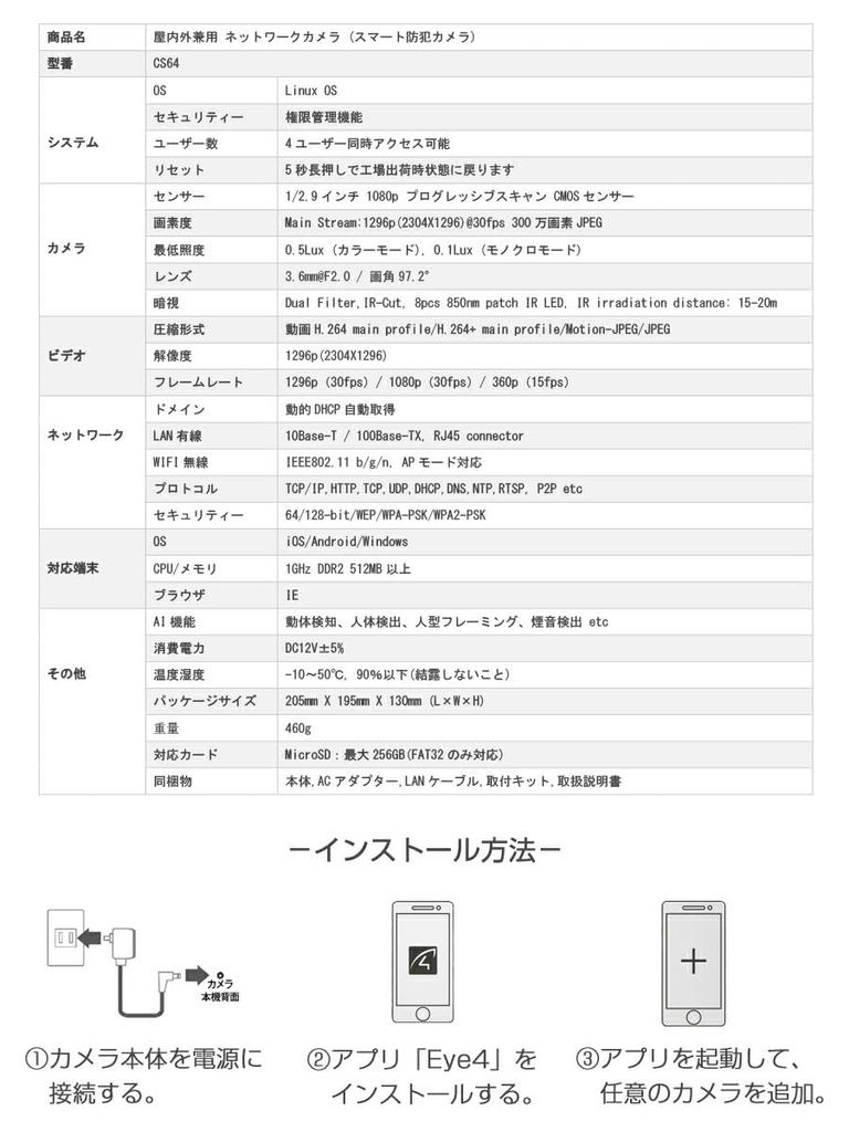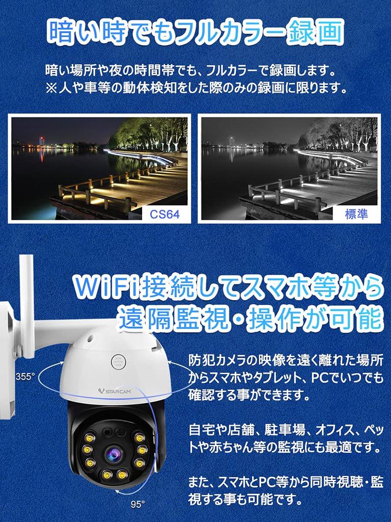 Security camera for indoor and outdoor use Wireless CS64 2K 1296p 3 million pixels Full color recording even at night Human body detection Motion