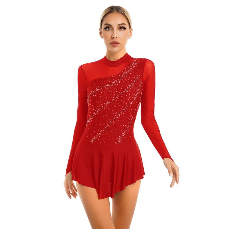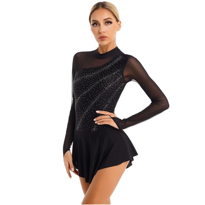Женское платье для фигурного катания, блестящий сетчатый купальник с длинными рукавами и стразами