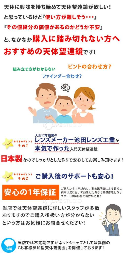 Сделано в Японии для вашего спокойствия! Вводный астрономический телескоп, созданный с большим вниманием к деталям производителем линз Ikeda Lens Industry! Если вы покупаете его впервые, то это оно! Это полноценный телескоп, которым легко пользоваться даже новичкам! В комплекте идет адаптер для съемки на смартфон! Так как это прозрачный искатель (искатель глазка) типа, нет необходимости в сложной настройке искателя! [Размер ширины смартфона: совместимо с 55-98 мм]