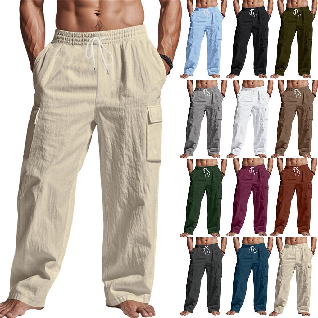 Мужские льняные брюки Four Seasons Thin Breathable Cargo Multi-pocket Loose Casual Wide Leg — купить товар онлайн с бесплатной доставкой до всему миру!