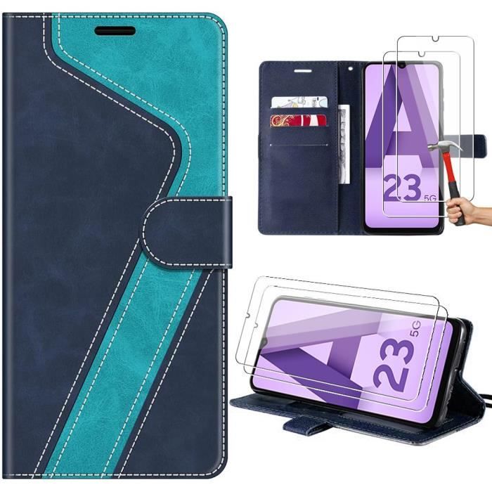 Coque + 2 Verres Trempés pour Samsung Galaxy A23 5G, Protection en Cuir PU à Motif avec Fentes pour Cartes et Béquille, Bleu