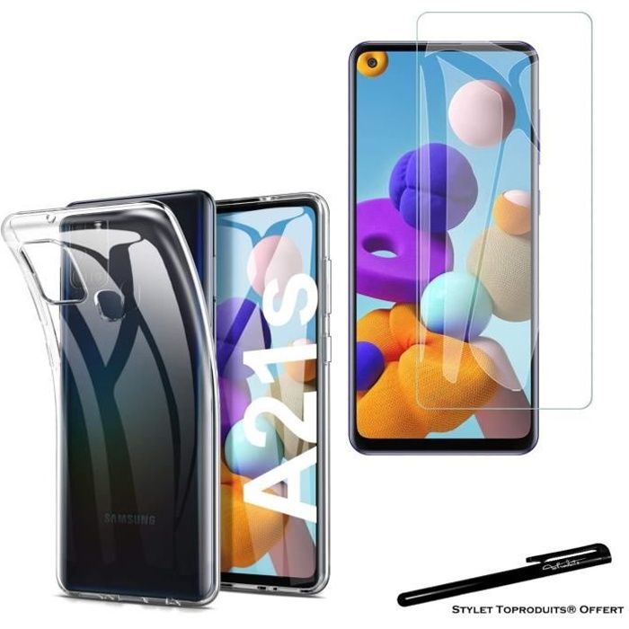 Verre trempé pour Samsung Galaxy A21S et coque de protection souple transparente avec Stylet Toproduits®
