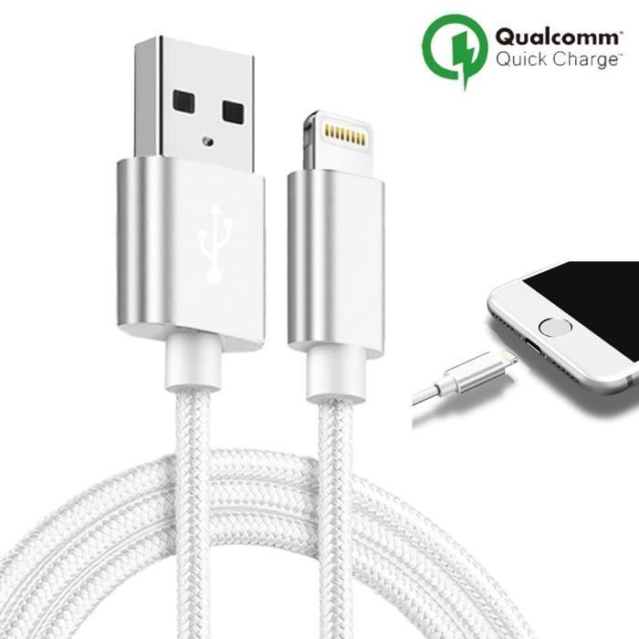 Câble USB pour iPhone - Nylon - 1M - Compatible avec iPhone 5 à 11 Pro Max - Couleur Blanc