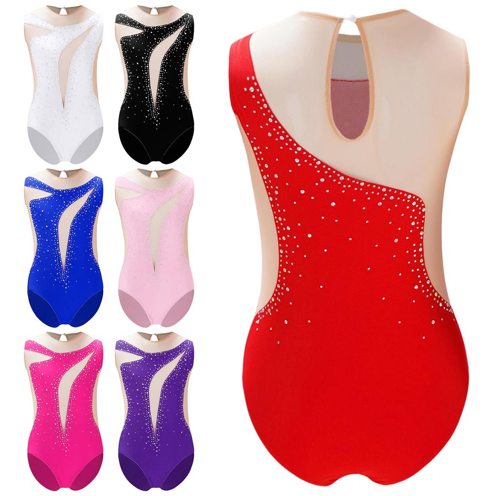 Детский боди для фигурного катания со стразами для девочек, прозрачная сетка пэчворк, без рукавов, танцевальный костюм