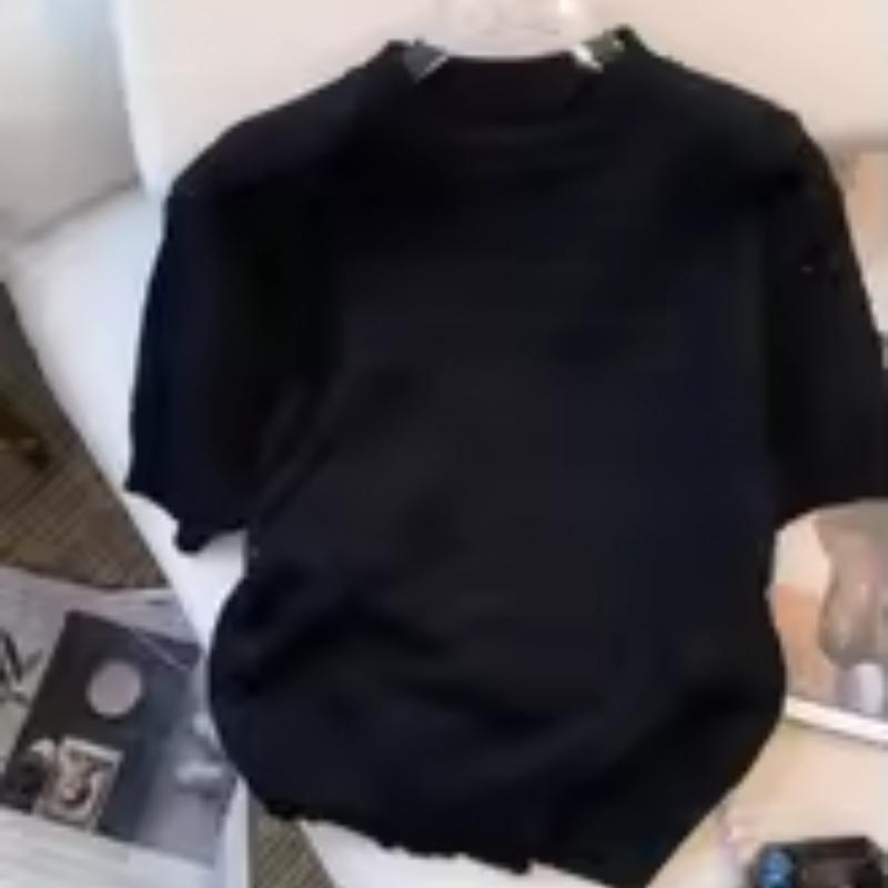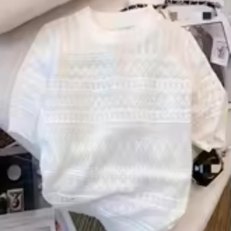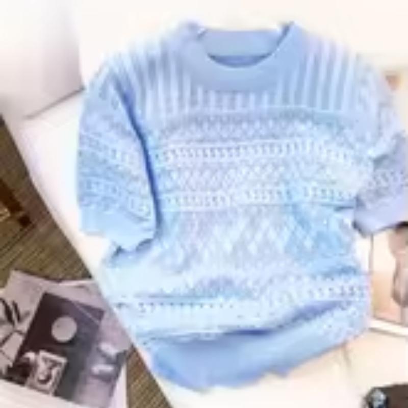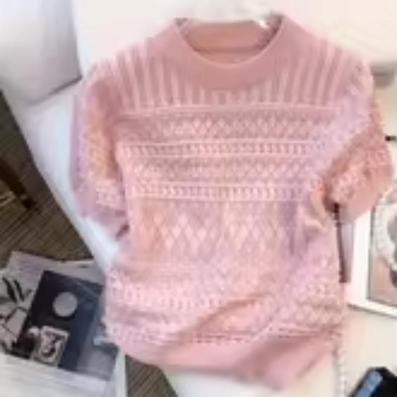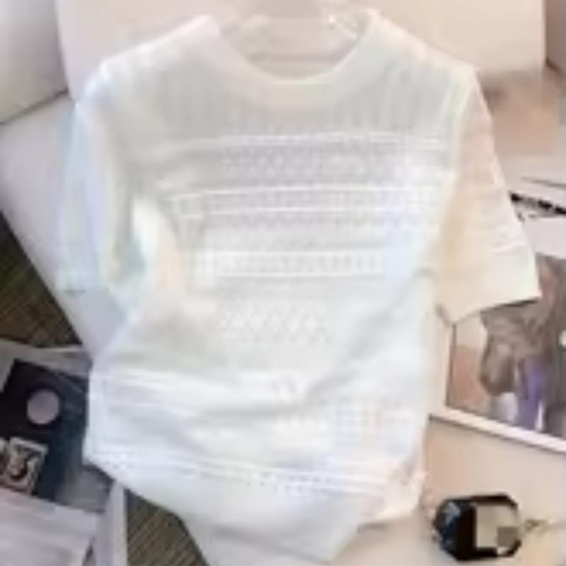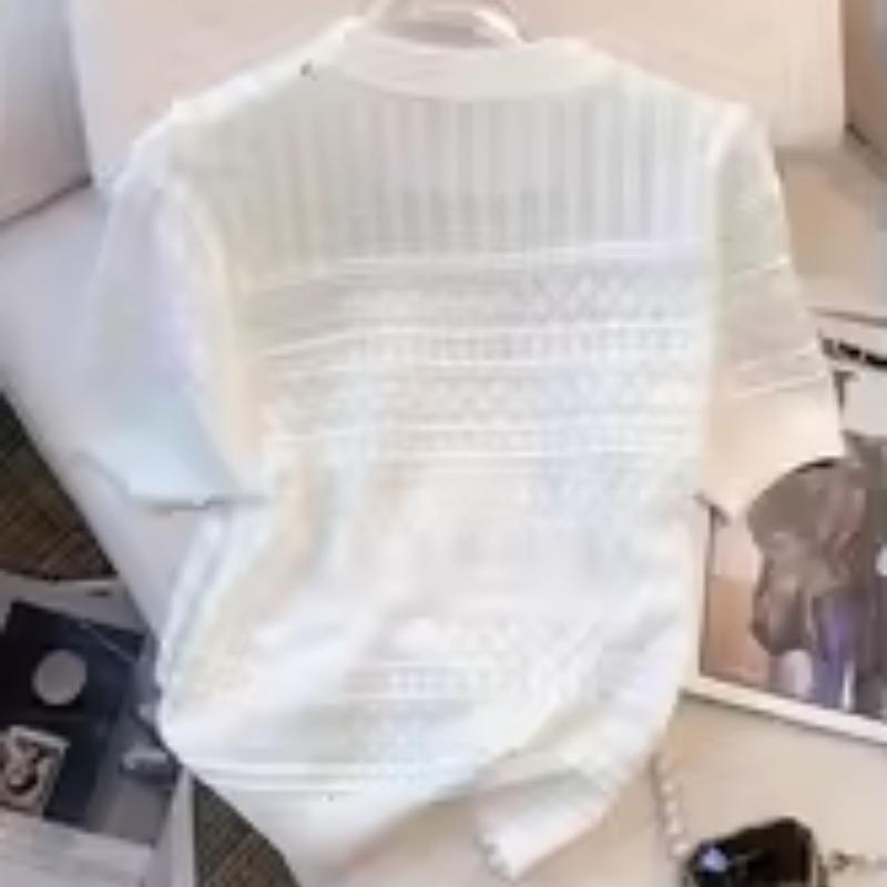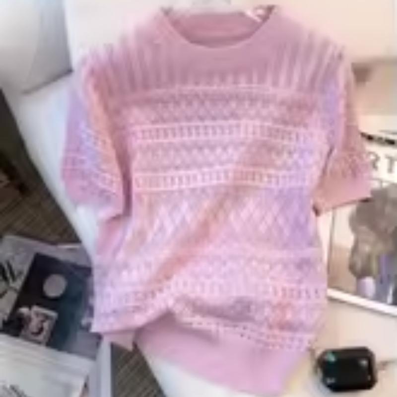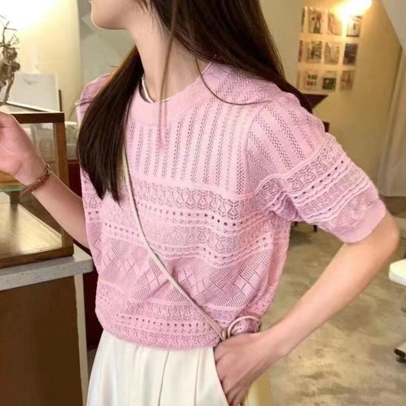 Летняя милая трикотажная рубашка с круглым вырезом и ажурными рукавами-пузырями из жаккарда, тонкий топ для женщин
