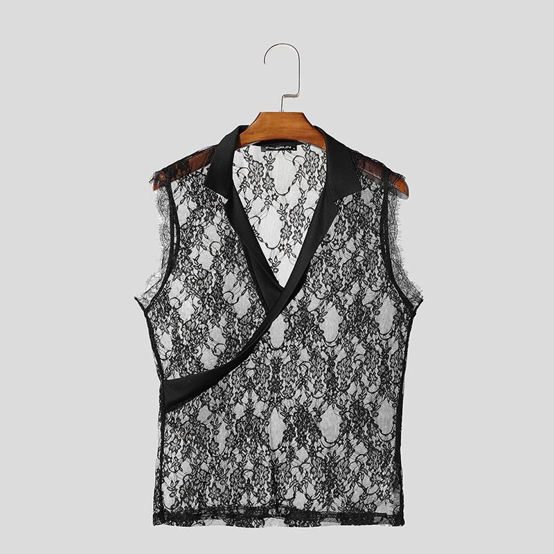 INCERUN Летние мужские топы без рукавов с V-образным вырезом и сетчатым кружевом в стиле пэчворк