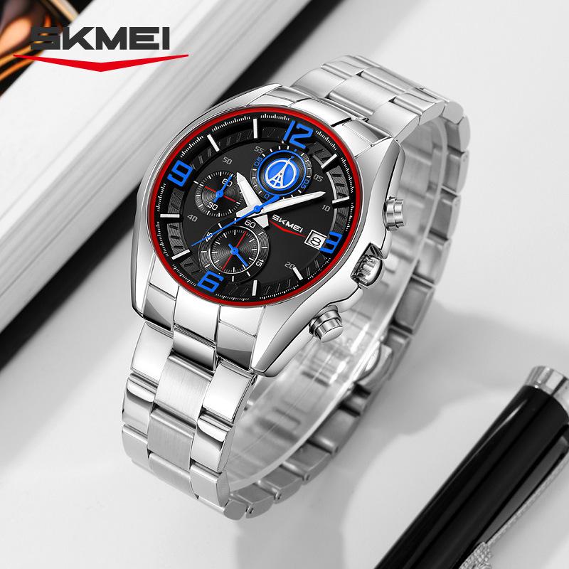 Часы skmei кварцевые мужские с ремешком из цельной стали, деловые многофункциональные, модные мужские водонепроницаемые часы с календарем