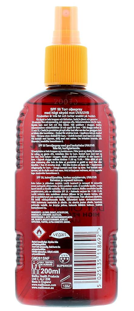 Malibu Сухое масло-спрей SPF50 Бронзирующее солнцезащитное масло 200 мл