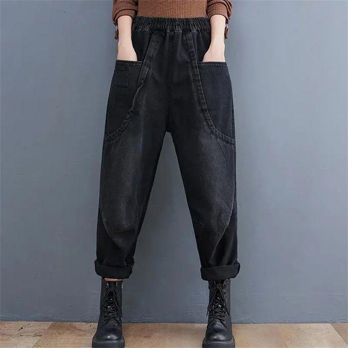 Jean femme-taille haute-Harem-rétro-rue-droit-amincissant-double poches-Noir