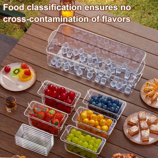В наборе 5 съемных отделений, ложки и зажим для легкого разделения.. Прозрачная конструкция обеспечивает наглядное представление продуктов питания, а функция слива снизу облегчает очистку.. В нижнем отделении можно хранить лед, чтобы продукты оставались свежими.. Идеально подходит для семейных встреч, пикников, барбекю и многого другого.. Универсальное дополнение к любому мероприятию!
