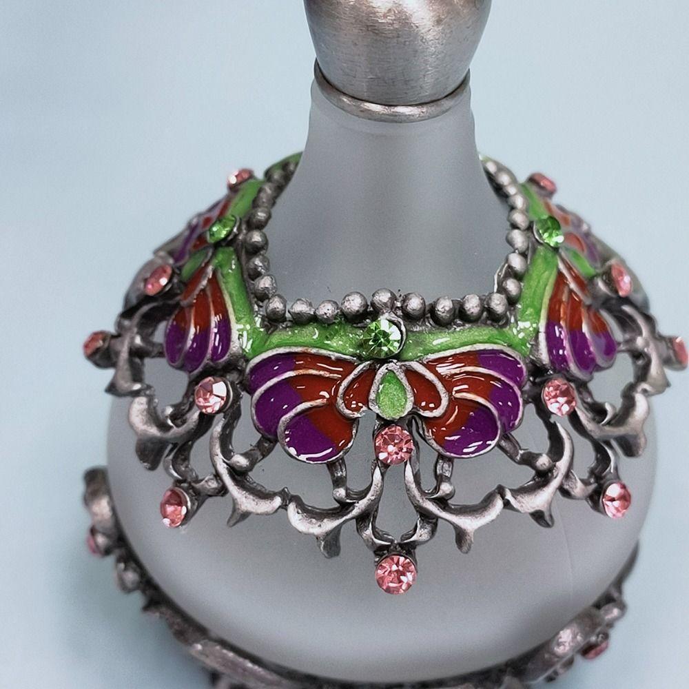 Изготовлен из высококачественного металла и стекла, инкрустирован хрустальными стразами и декорирован старинными металлическими резными узорами, конический флакон, небольшой и изысканный, покупайте с уверенностью.