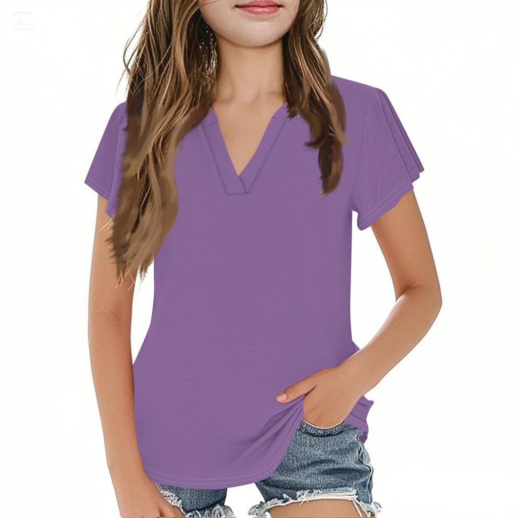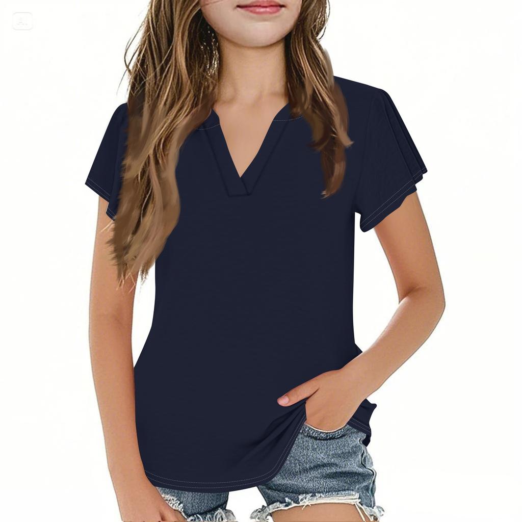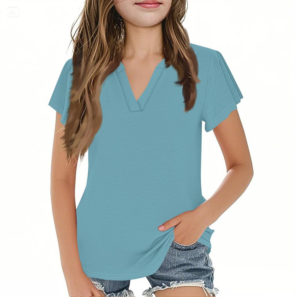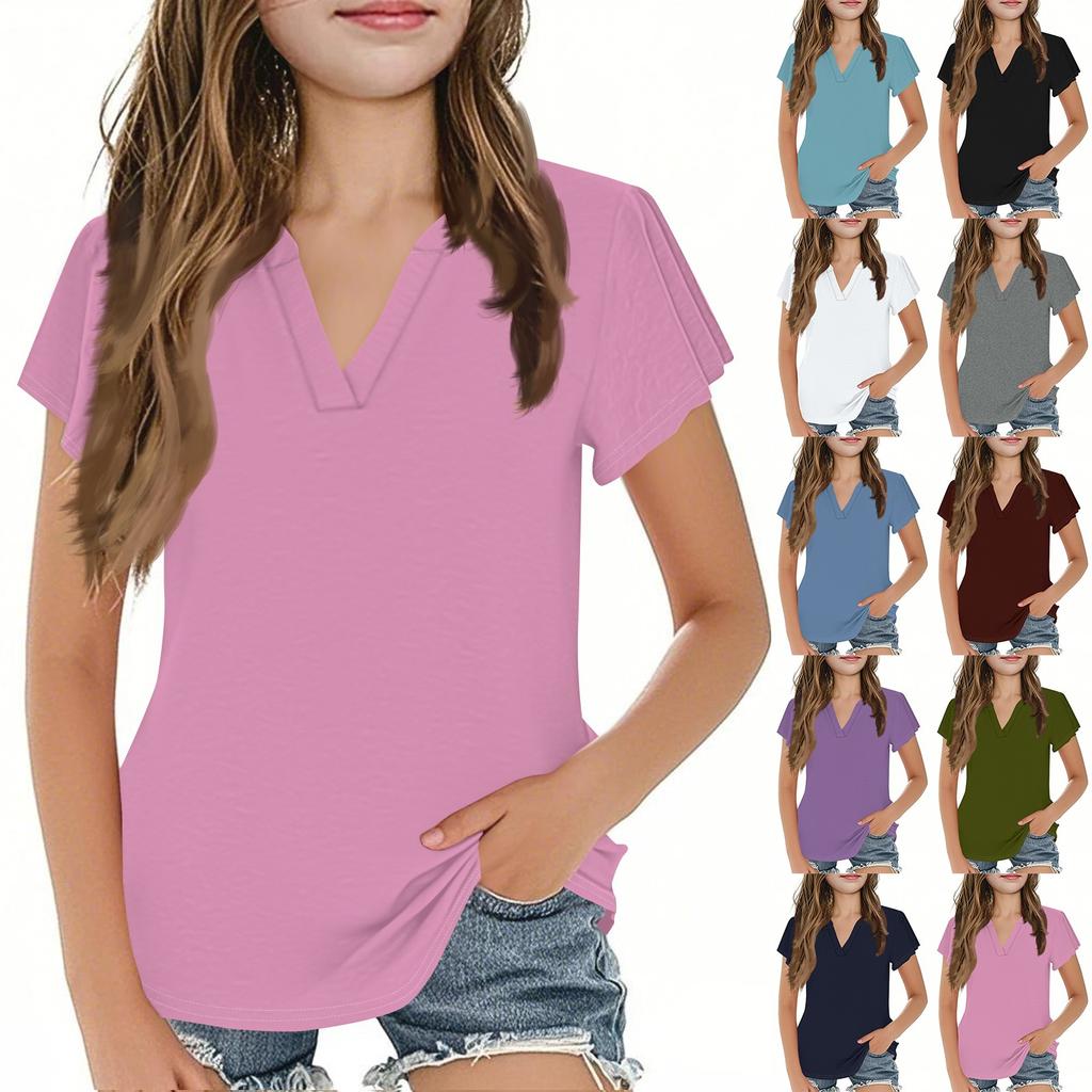 Летний детский милый и повседневный модный однотонный топ для девочек с короткими рукавами и V-образным вырезом