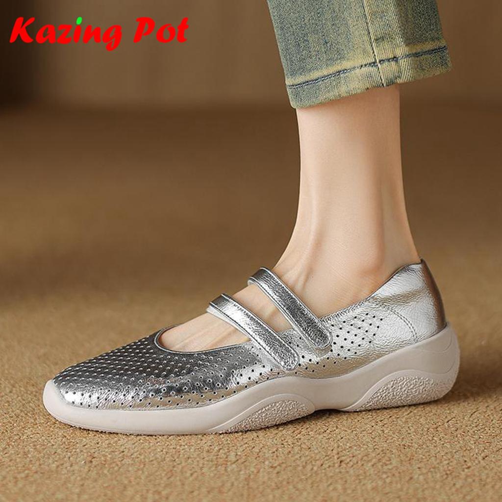 Krazing Pot Sheepskin Spring Summer Size 41 Carving Thick Low Heels Women Round Toe Hollow Decoration Breathable Hook Loop Pumps — купить товар онлайн с бесплатной доставкой по всему миру!