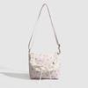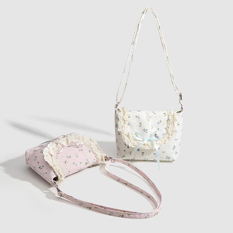Очаровательный внешний вид: Эта сумка через плечо имеет красивый светло-розовый холщовый корпус, украшенный нежным голубым цветочным узором.. Белая кружевная отделка и бант на обложке добавляют милую и женственную нотку, делая ее визуально привлекательной..