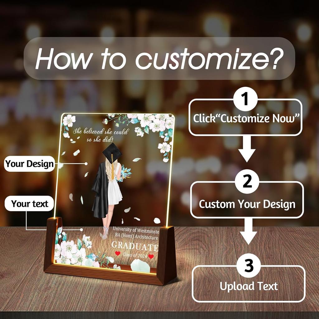 Индивидуальные подарки на выпускной для нее и него: Выберите понравившийся вам дизайн ночника, нажмите кнопку «Настроить сейчас», следуйте подсказкам, чтобы добавить фотографии и текст в отведенную область, или выберите понравившиеся элементы. Выберите цвет ночника, основание и размер, чтобы завершить настройку. Мы изготовим для вас классные подарки на выпускной в соответствии с вашими требованиями.