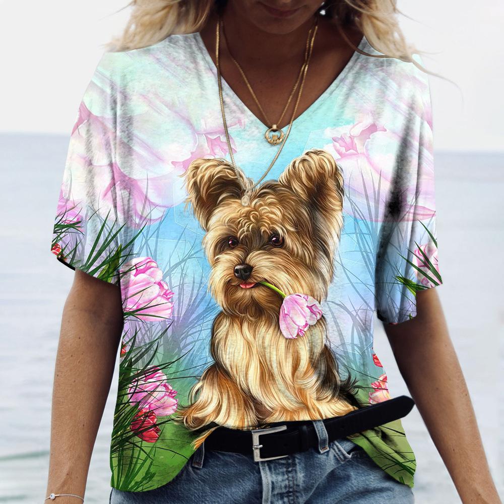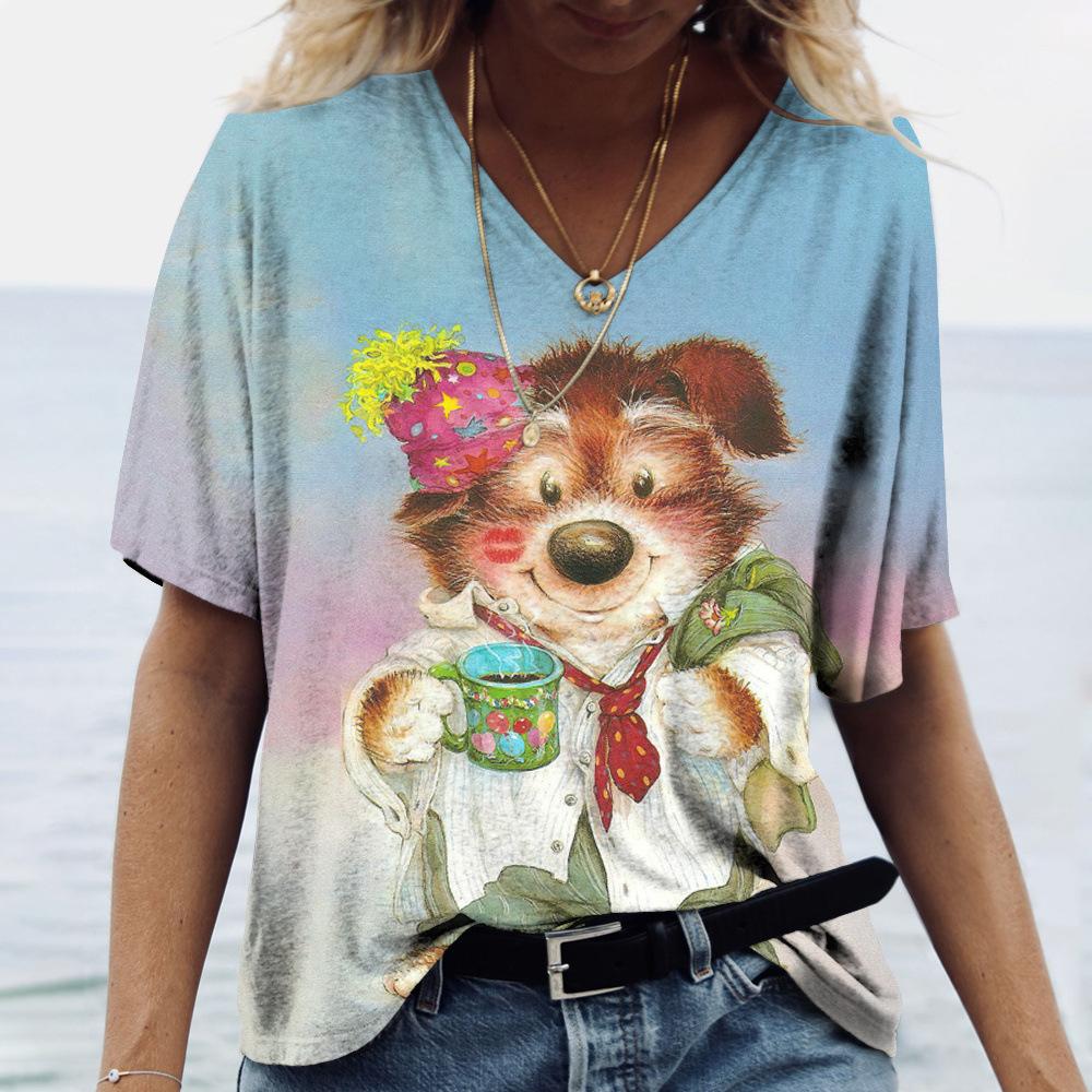Летний топ с V-образным вырезом и принтом 3D-собаки, модные повседневные женские футболки с короткими рукавами