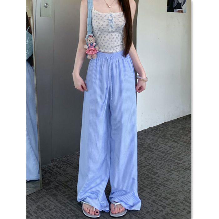 Повседневные брюки в вертикальную полоску для женщин Летом Новые драпированные брюки для ходьбы Прямые Свободные Широкие брюки до пола