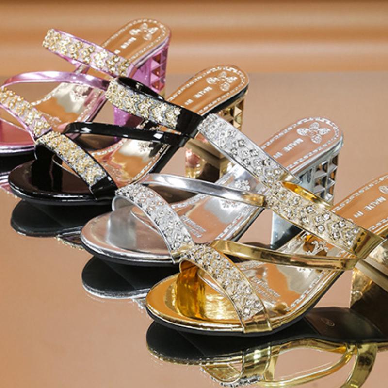 Весна/лето Новые женские босоножки со стразами и круглым носком, широкой посадкой, на среднем каблуке - Мягкий комфорт, повседневный пляжный стиль и блестящий прочный дизайн