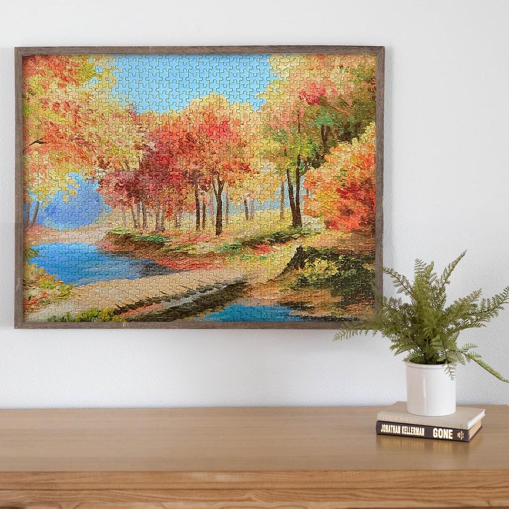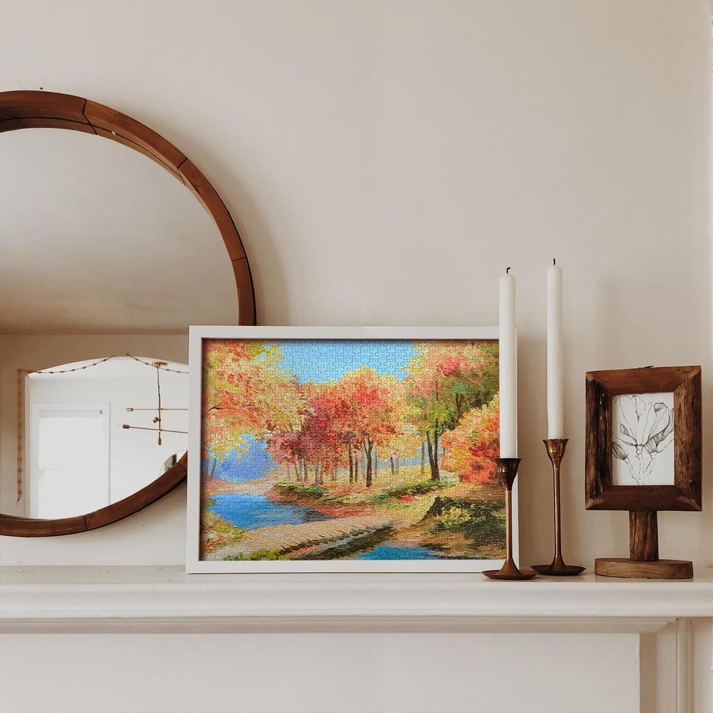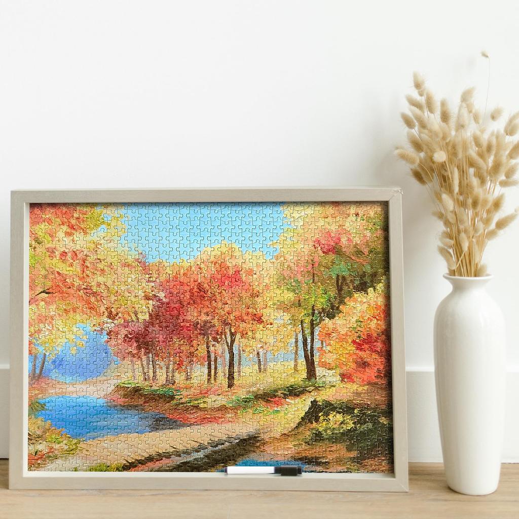 [Тихий осенний пейзаж] Пазл, изображающий спокойную осеннюю сцену с чистой рекой и кленовым лесом, отражающимся в небе.. Вы можете наслаждаться головоломкой, погружаясь в прекрасные природные пейзажи.