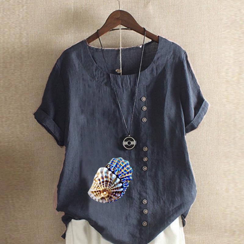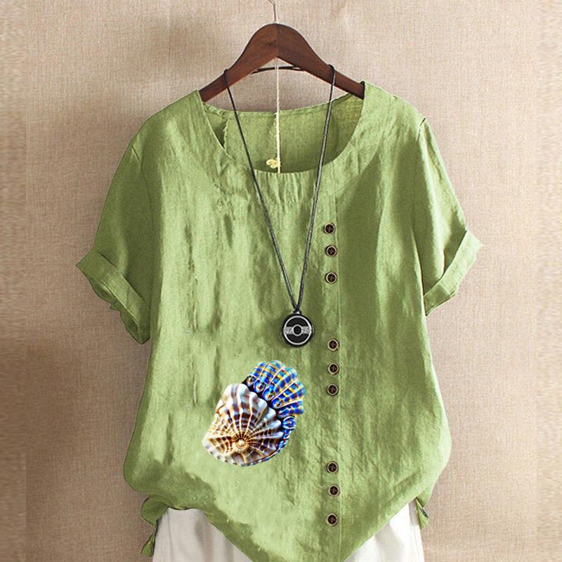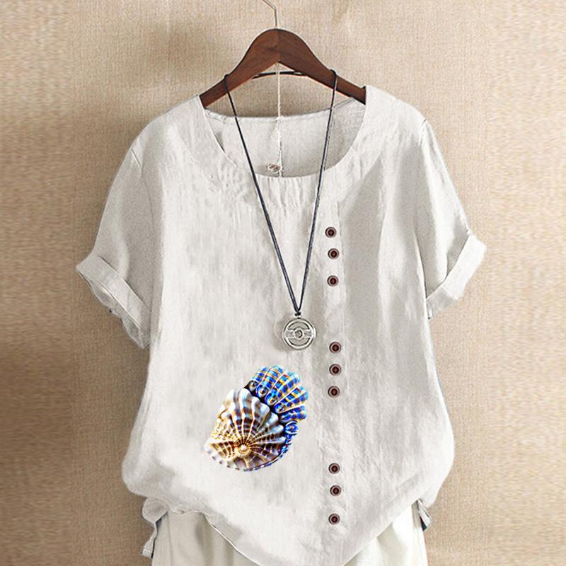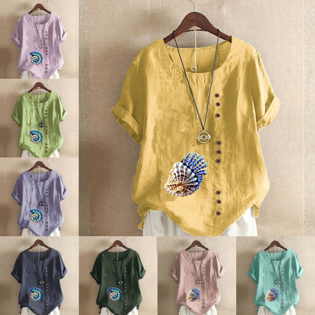 Женская модная футболка с круглым вырезом и коротким рукавом, повседневная хлопковая льняная рубашка с рисунком, свободная летняя блузка с принтом ракушек для отдыха, топы